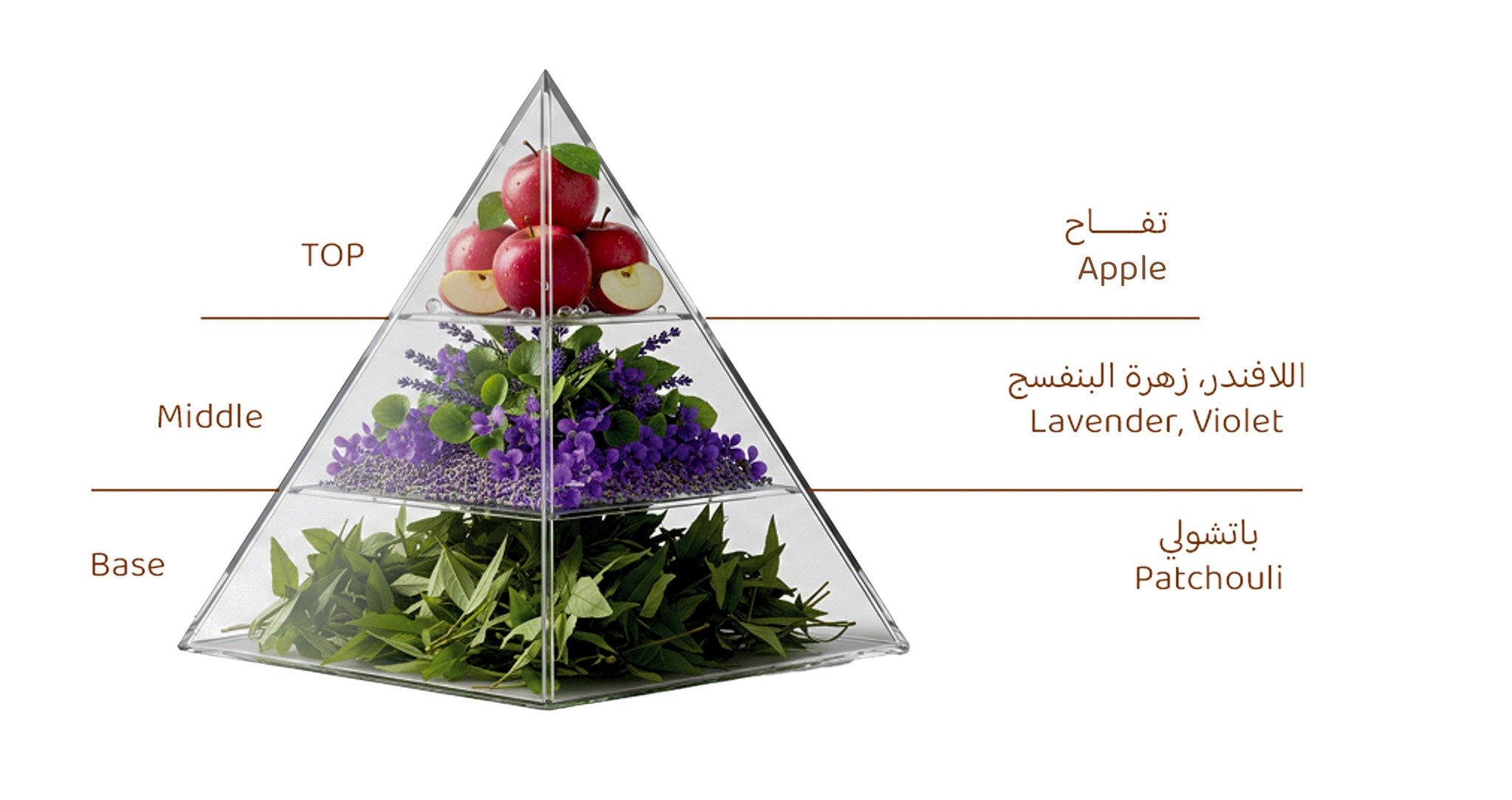- Une note fruitée et rafraîchissante de pomme, un élégant bouquet de fleurs envoûtantes mêlé à un parfum chaud et boisé de patchouli et d'ambre.